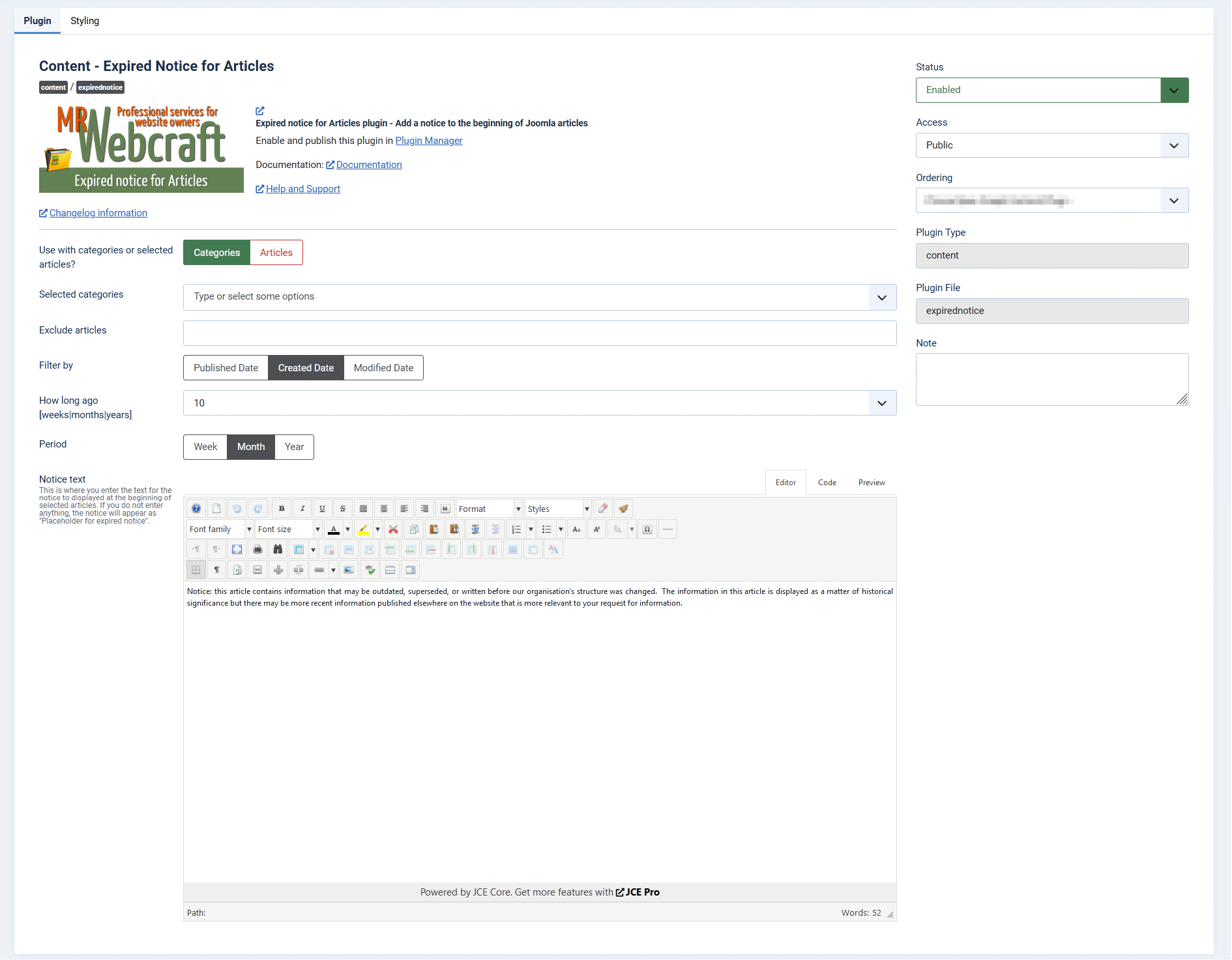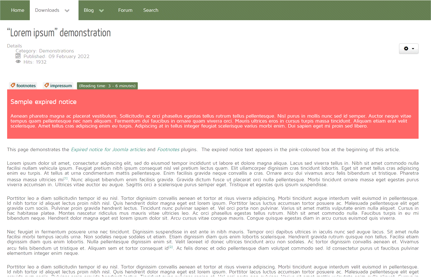 Based on the successful Impressum for Joomla articles plugin, Expired notice for Articles provides a convenient way to add additional notes—text, images, etc.—that will be displayed on all articles within a specified category or categories filtered by the date when the article was created, published or last modified, with the added ability to exclude certain articles from selection or base the selection only on certain articles. The plugin can be tailored to a broad range of uses, for example, to display legal notices, disclaimers or other advice pertaining to those articles. The difference between this plugin and the “impressum” one is that this plugin displays the notice at the beginning of the article and offers a range of conditions, e.g. display articles created over n weeks, months or years ago.