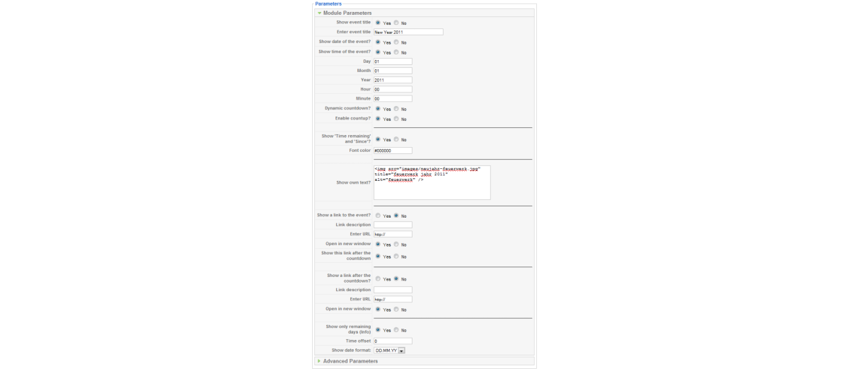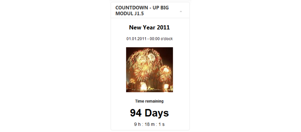 Event countdown module CDUB for Joomla! This module displays a countdown leading up to a specific date. Once that date has passed, it can switch to a count-up display to show the time that has passed since the event. You can customise the output by including a description and adding a link before and after the event time. The counter can also be either static or dynamic.