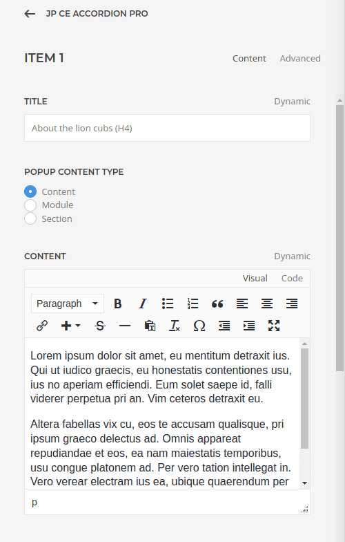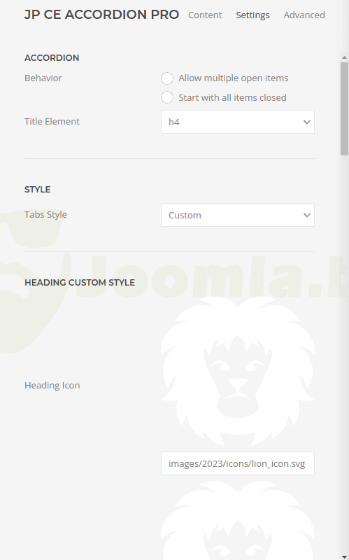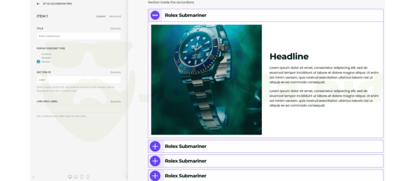 JP CE Accordion Pro is an advanced accordion extension for YOOtheme Pro that enables users to load sections and modules inside of the accordion content. With this feature, you can easily create sophisticated layouts for your accordions. The extension also supports dynamic content, allowing you to build complex templates. Additionally, you can display modules/widgets inside of the accordion items, and combine various elements to create unique content. The extension even allows you to add a heading (h1-h5) to the accordion titles, which makes it easier to integrate them into your website's content structure.