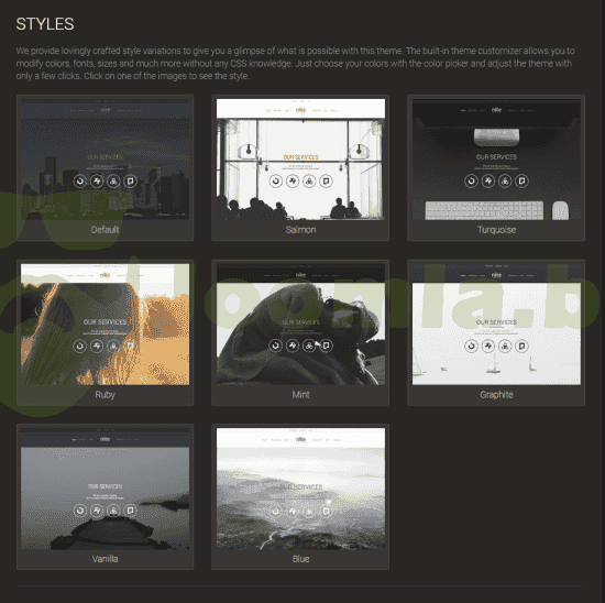 Nite is based on Warp 7 and provides full support for LESS. The front-end is completely built with UIkit and can be modified through the Customizer. You can change colors, spacing and fonts without having to write a single line of code. To get you started, Nite already provides 8 different style variations to choose from.