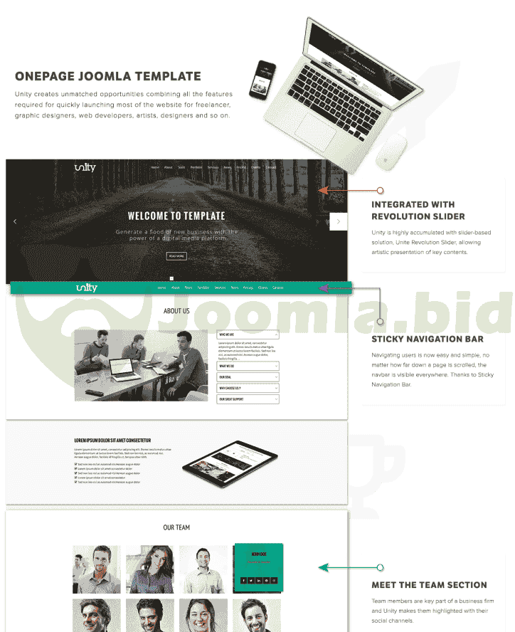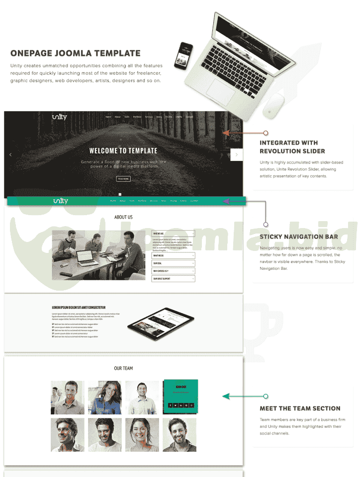 Unity is a responsive One Page Joomla template, can adapt automatically to mobile, tablet, desktop and Kindle. Forget to make separate layouts or contents for any other screen and viewing devices.