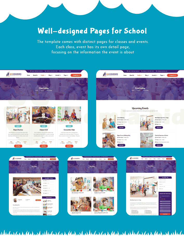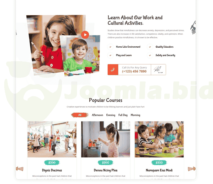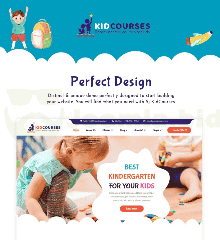 Sj KidCourses is an attractive Joomla template for kids education, preschool, kindergartens, elementary, primary school, secondary school and education related sites with creative and colorful design style. Sj KidCourses Joomla education template allows you to add needed information for your kindergarten courses with well-designed pages for classes: Dedicated Class Listing page for all your classes displayed in blocks with particular information; Single Class Detail page to show all class details.