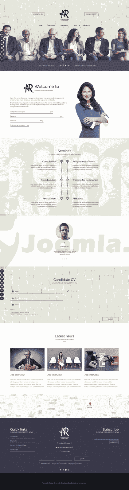 Human Resource Management - Joomla recruitment template with modern look and nice design, used Google fonts, created with latest technologies such as HTML5, Bootstrap 3, CSS3, compatible with all well known browsers includes IE10, IE11, Firefox, Safari, Opera, Chrome.