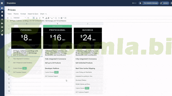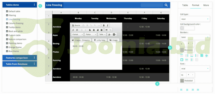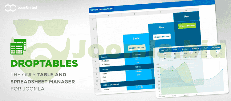 Droptables is the only table manager for Joomla that offers a real spreadsheet interface to manage tables like excel, google sheet. Plus, all the tables can be managed from your editor. Create table, apply some really cool themes and start playing with the content. Table copy, table category, some calculation functions are in the inner part of the toy. As Droptables is fully managed from your editor, it works both frontend and backend in the same way.