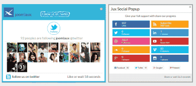 JUX Social Popup is one of the most effective module which helps you increase number of followers in your social networking sites. A social popup displays numerous social network’s like, share, follows buttons to impress your visitor and keep them interact with you via different channel like Facebook, twitter, google plus, and other 7 social network pages. It is a joomla social multi share extension from JoomlaUX team.