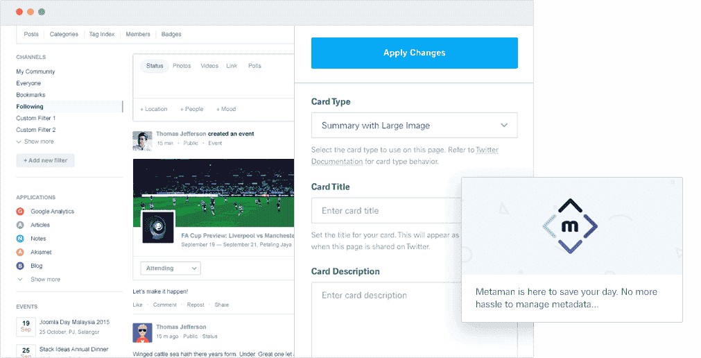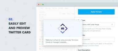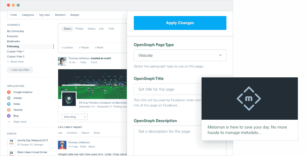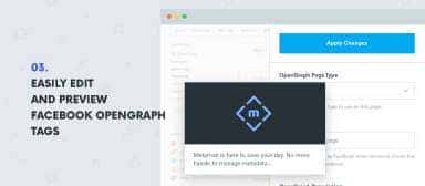 MetaMan simplifies your daily meta data, opengraph and twitter tag management. It allows a site administrator to be able to load up the respective forms on the front end without having the hassles to go through each of these metadata settings in the menu. You can even upload images for opengraph and twitter directly on the page too. MetaMan helps managing your day-to-day metadata, Twitter cards, Facebook open graph across all pages effortlessly and effectively in a brisk!