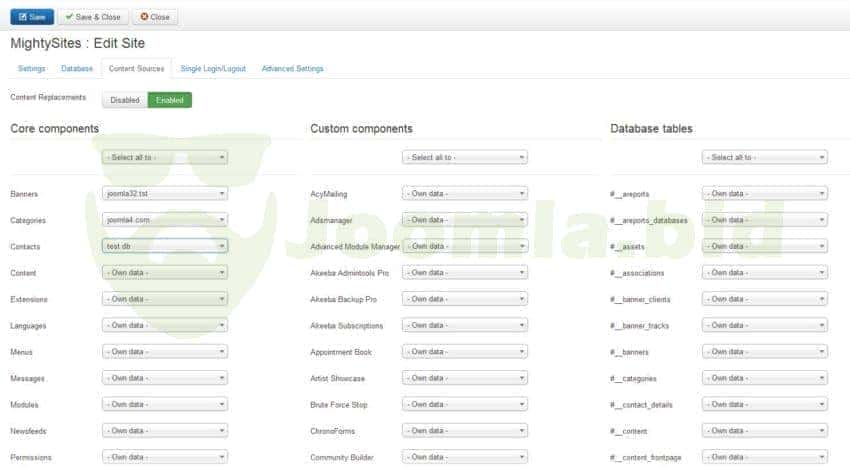 - Sharing database data of default Joomla! components for Extensions, Permissions, Users, Templates, Categories, Content, Languages, Menus, Modules, Newsfeeds, Weblinks, Banners, Contacts, Smart Search.