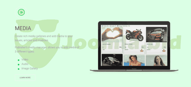 Publisher Turns You Into a Media Mogul. Publisher is the ultimate publishing platform for Joomla 3.x. It lets you create a slick news portal with the professional look of CNN, FOX News or People Magazine. And it’s simple. Publisher is extremely easy to use and set up. It works right out of the box turning your site into real news hub in minutes.