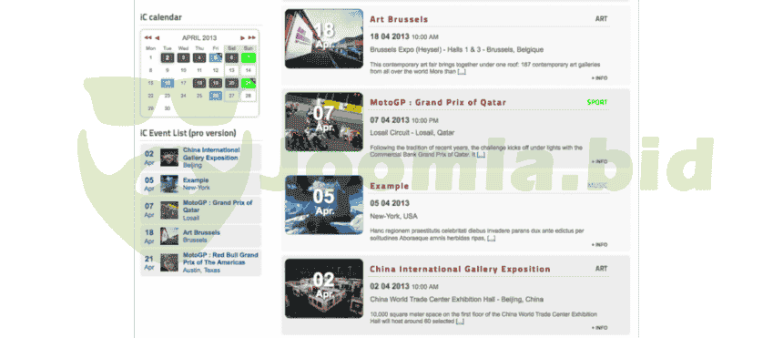 Display of events takes the form of a list, for which you can apply filters (upcoming dates and/or past, category(ies), ordering by dates...) and customize graphic elements (choice of theme, size of the Google map, number events displayed per page, date format in your culture (for languages available in iCagenda), etc ...)
