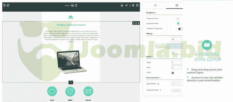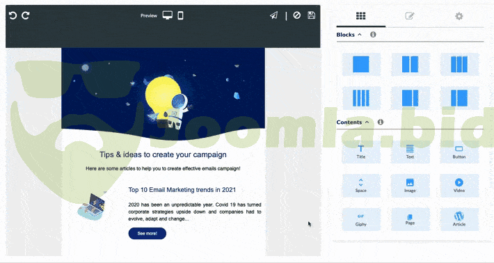 No HTML knowledge required, enjoy the Newsletter creation with our drag and drop editor
