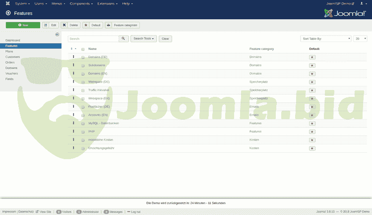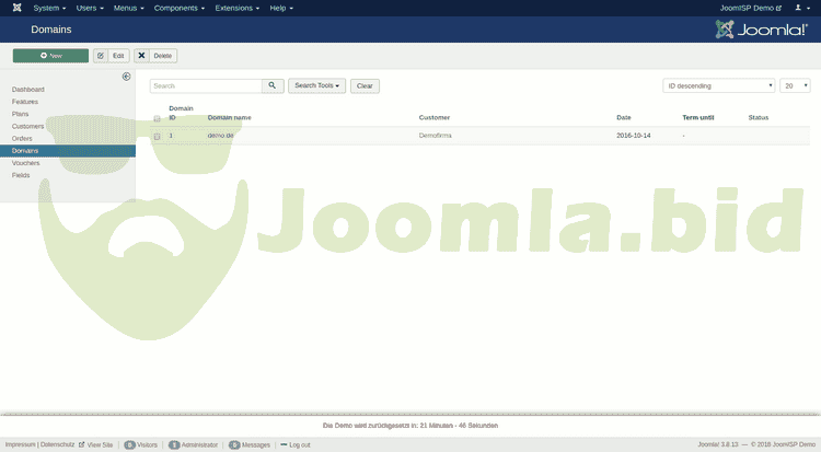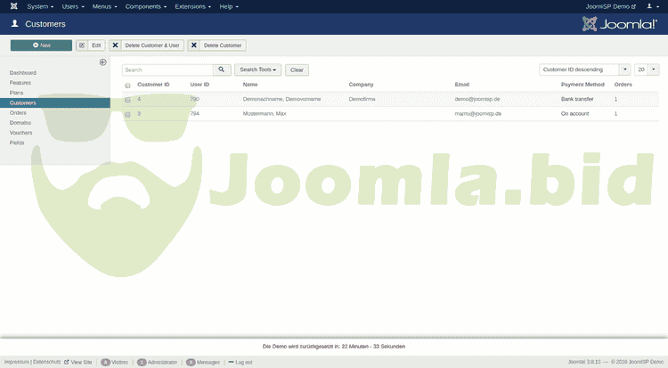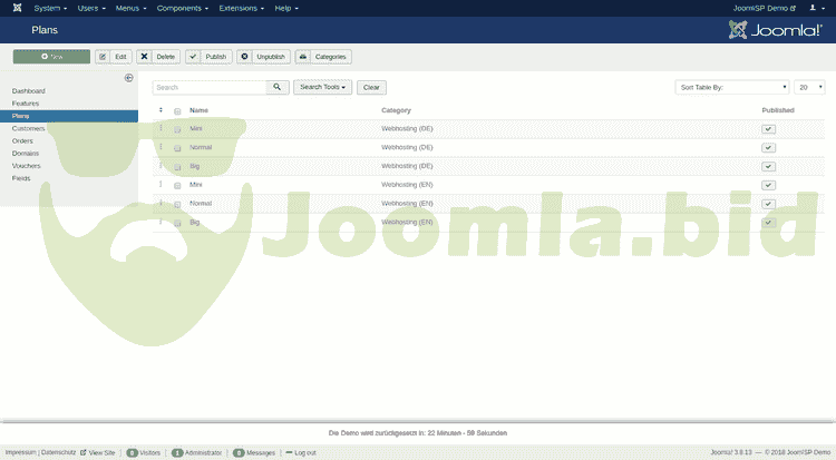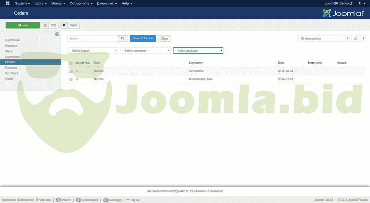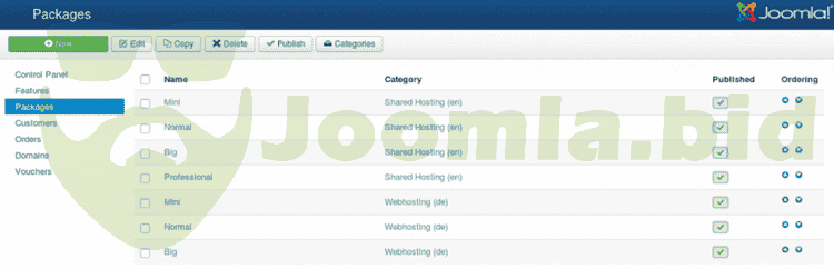 JoomISP is a component for Joomla! which offers various Internet Services such as Webhosting, Server rental or VoIP. All offers, orders, customers and domains can be managed via the Joomla! backend. Customers can also view their orders in the Joomla! frontend. With various plugins for Server Control Panels for example Confixx, Plesk, ispCP, i-mscp, Cpanel/WHM, ISPConfig and LiveConfig, an easy creation of webhosting accounts is possible.
