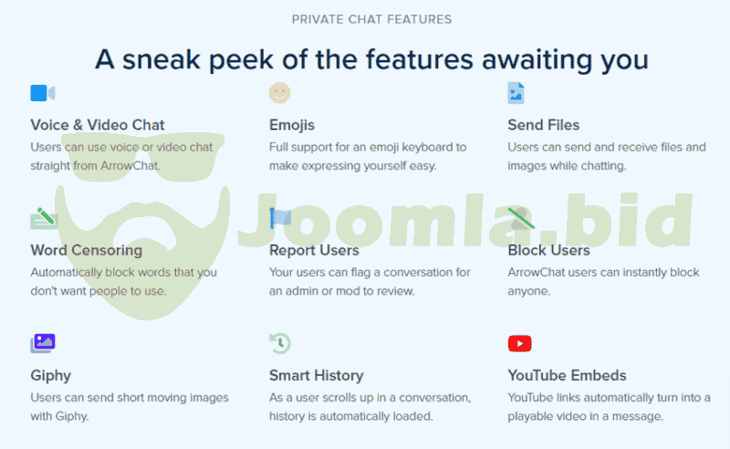 ArrowChat is a self-hosted jQuery chat script that lets your Joomla users text and video chat with each other. ArrowChat installs in minutes with no programming knowledge required.