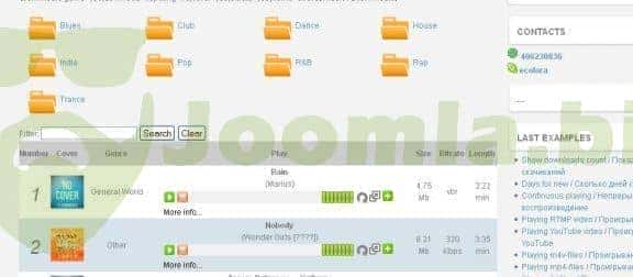 It has cover, volume control, rating, down-count, play-count, auto-play, filter, repeat button, pagination (classic and modern), user upload, FB social button, timer and some other functions.