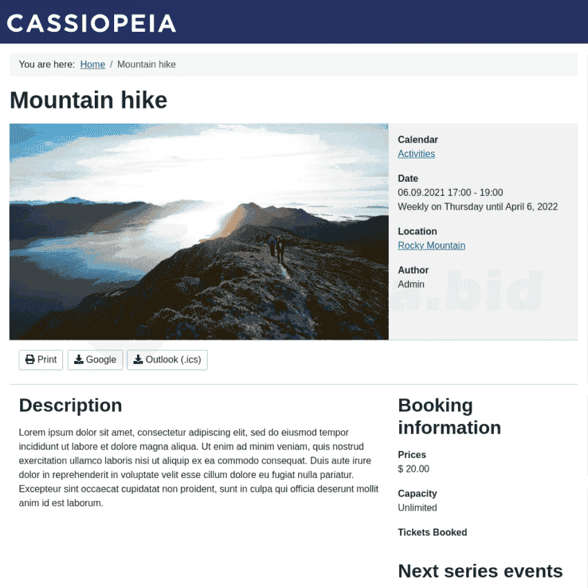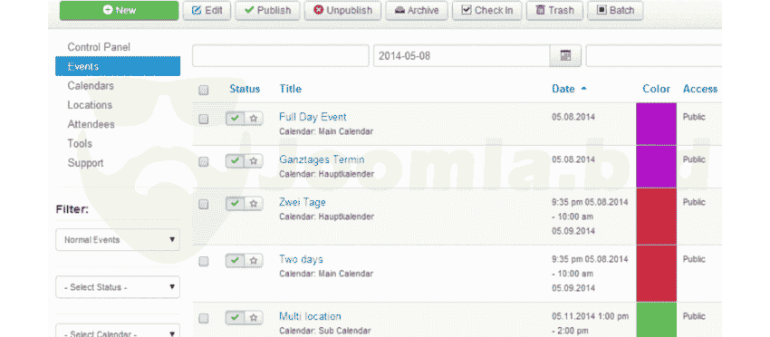 - Integration/Import of external sources like Ical/Jomsocial/CSV/Google calendar/JEvents/JCalPro/Facebook events/MS Exchange/CalDAV/Meetup/SQL