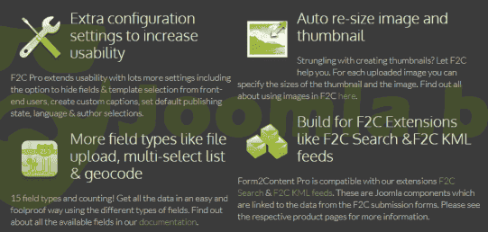 We are "Joomla compatible"! Since Form2Content creates Joomla articles we work with all extensions that use com_content but also with all Joomla content plugins. This way you decide which review extension, gallery plugin or slideshow you want to use.