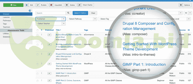 OSCampus is 100% integrated with Joomla. You don't need any complex integrations. You can manage your classes through the native Joomla interface and use Joomla core features.