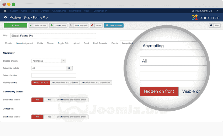 Integrate your Joomla forms with Acymailing, Mailchimp and Freshmail providers. Also you can send the messages to Community Builder, JomSocial, SobiPro, Zoo and Google Sheets.