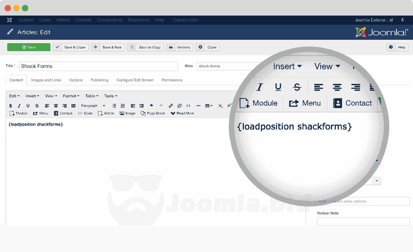 Any form you create with Shack Forms can be placed inside articles. In fact, wherever there's text area in Joomla, you can insert your forms.