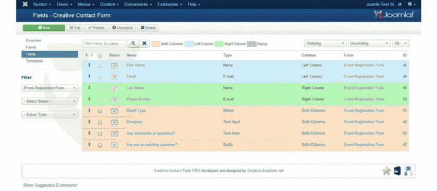 Firstly, please enable System - Creative Contact Form plugin from Extensions > Plug-in Manager page. Afterwards, navigate to Components > Creative Contact Form > Forms page from the top menu of your Joomla! administrative panel.