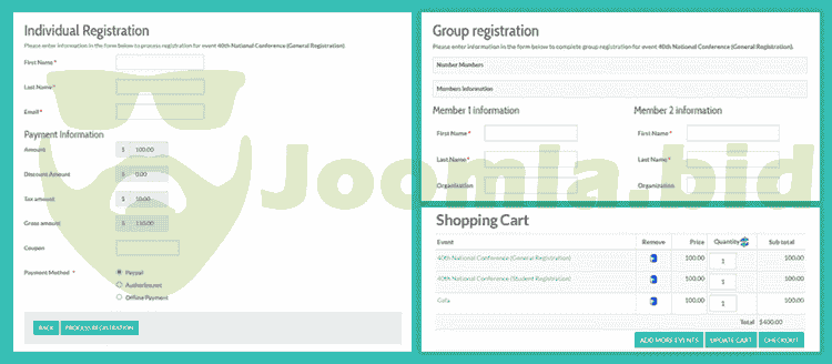 Events Booking is the most powerful, features rich, easy to use Events Registration extension for Joomla. It allows you to create events(both free and paid), allows registrants to register for these events(Individual, Group registration or Shopping cart) and process payment via online payment gateways. Main features...