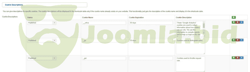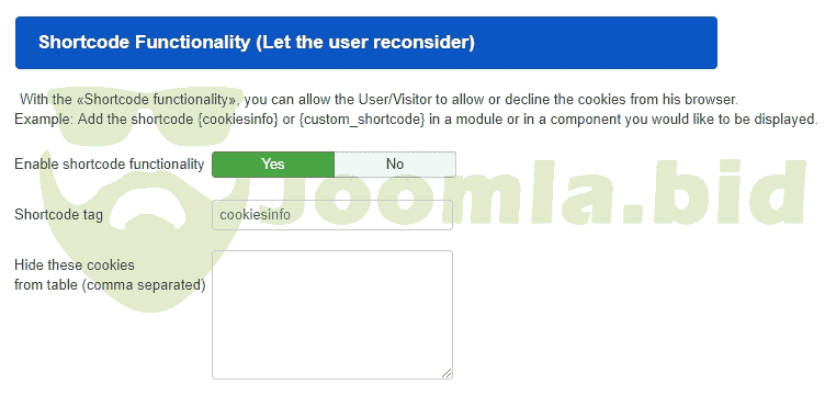 - Shortcode Functionality. (You will be able to display a table with the accepted website cookies and give the opportunity to the user reconsider or delete the cookies from his browser. Example of shortcode: {cookiesinfo}.) [NEW FEATURE in v3.3.0]