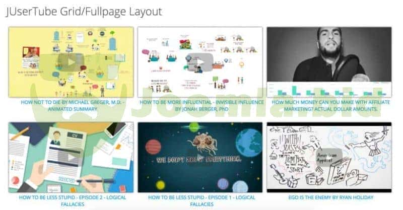 When you have multiple videos to show embedding them makes the site load slow. JUserTube solves that by showing the thumbnails instead of loading the whole YouTube video player. When the user clicks a thumbnail, the video loads on a LightBox (popup). Layouts with embedded player is also available. You can also direct the user directly to YouTube instead of showing the video in a LightBox.