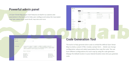 The tool is to help generate short code to embed the defined Open Street Map to article, custom HTML module, contact form ... Admin can change configuration values and select parameters then copy the code. You can have different configurations for each map by using the code generator. Change the default location to your desired location every time you generate code.
