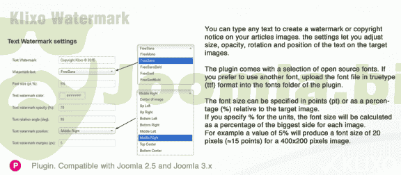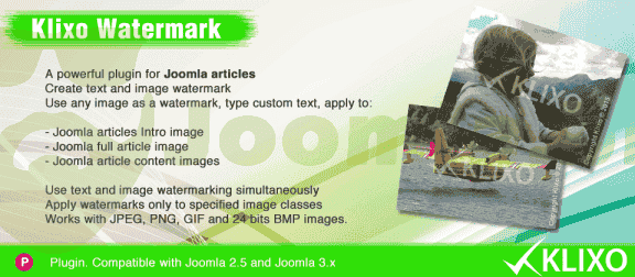 Klixo Watermark plugin is compatible with Joomla 2.5 and Joomla 3.x.