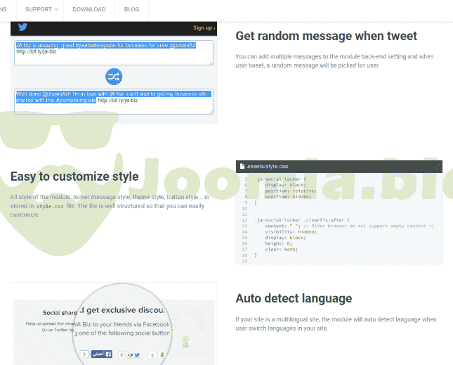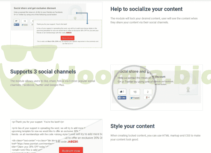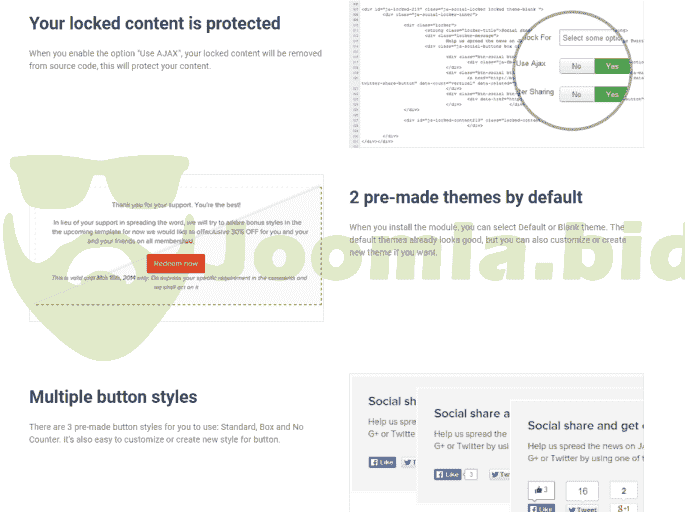 JA Social Locker module is the best choice if you want to boost your campaign, it helps increase traffic to your site by encourage people to share your content via social channels. The module will lock your desired content (promotion info, coupon code ...) in any article. The locked content is only displayed to user when they share your content via their social chanels: Facebook, Twitter, Google Plus. The module comes with multiple pre-made themes and buttons styles, it's also easy to customize style.