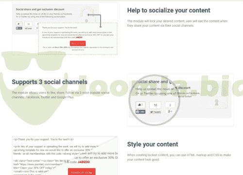 The module will lock your desired content, user will see the content when they share your content via their social channels.