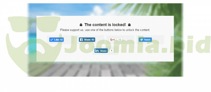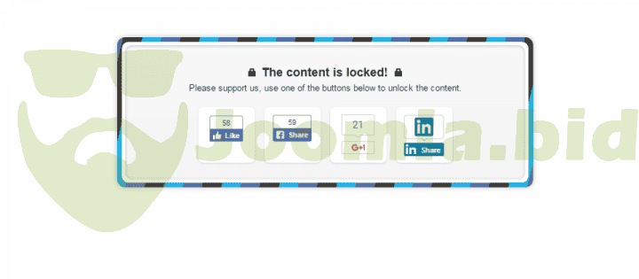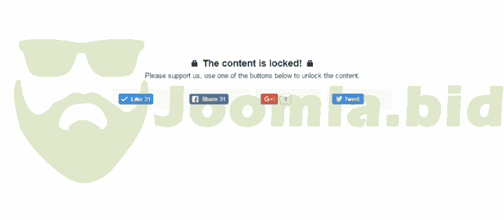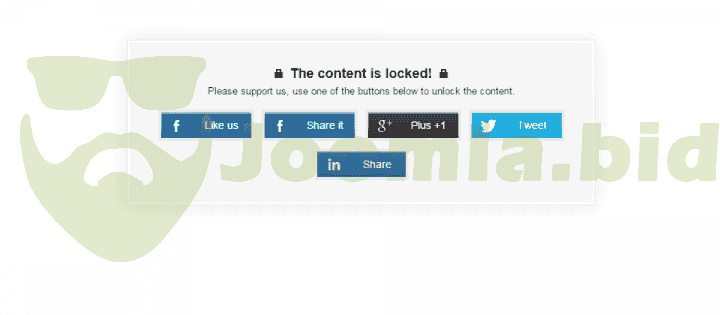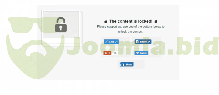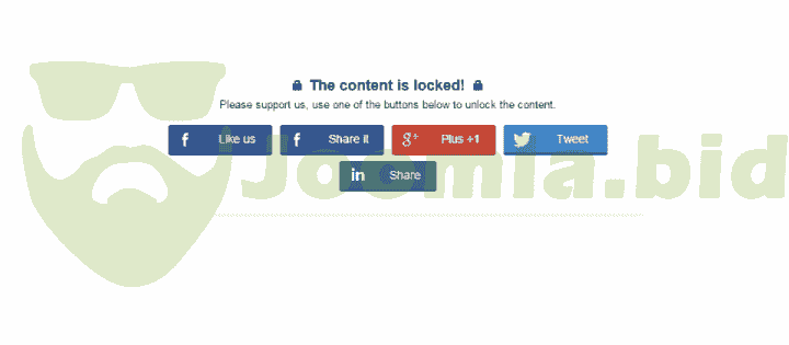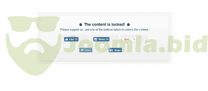 JO Social Content Locker using for joomla content allows you to lock a part of content or any page on a web page until a user clicks one of the social buttons (Facebook Like, Facebook share, Tweet tweet, twitter follow, Google +1, Google share, Linkedin, YouTube Subscribe) and help you to get more likes/tweets/+1s, traffic and customers!. It is very simple to use and adaptive to any Joomla 1.6, 1.7, 2.5 and 3.x website