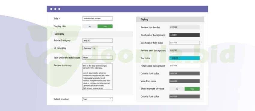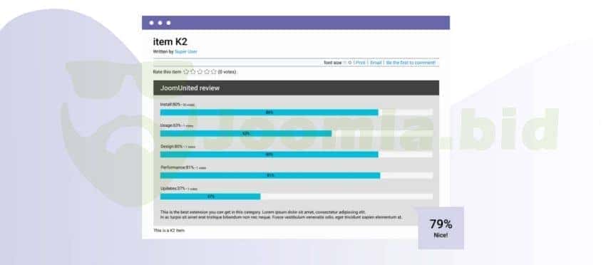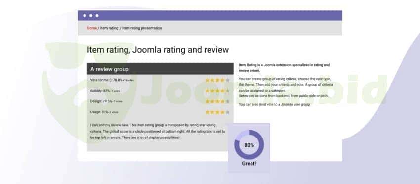 Item rating is a powerful review and rating system for Joomla and K2. The extension has a flexibility in review and rating you've ever had before. You can add unlimited rating group with unlimited criteria inside. Each criteria can be a different voting tool like percent bar, star, icons or thumb up/down. Then you get a global score and you can write a review. All the vote and review can be done directly from a joomla article.