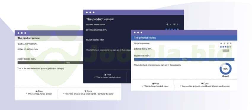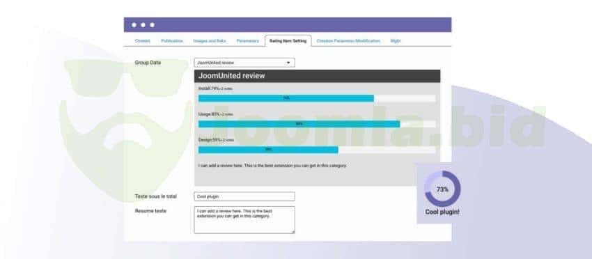 The extension has a flexibility in review and rating you've ever had before. You can add unlimited rating group with unlimited criteria inside. Each criteria can be a different voting tool like percent bar, star, icons or thumb up/down. Then you get a global score and you can write a review. All the vote and review can be done directly from a joomla article.