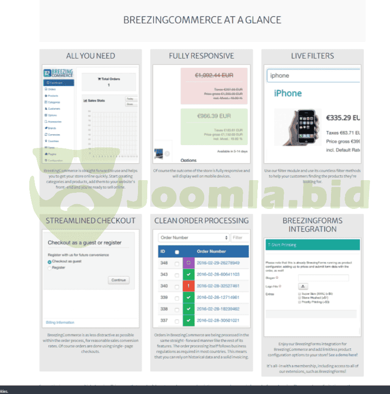 The commercial version of THE easy-to-use but yet powerful shopping cart and e-Commerce extension for Joomla! The easiest-to-use shopping cart for Joomla! We are proud to announce the release of Breezing Commerce, a professional eCommerce and shopping cart for Joomla! With Breezing Commerce, you are able to setup your shop very quickly, while your customers will be shopping within a straight-forward and streamlined order process.