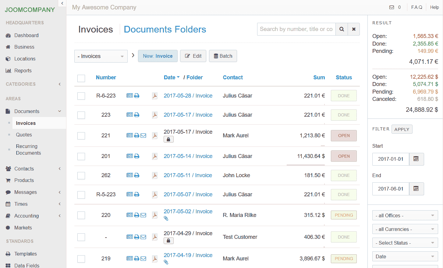JoomCompany is the most powerful office and invoicing Joomla extension for freelancers, small and medium-sized enterprises. Create invoices, bills, offers, manage master data of your clients, observe products trends, record working times, coordinate projects and much more.
