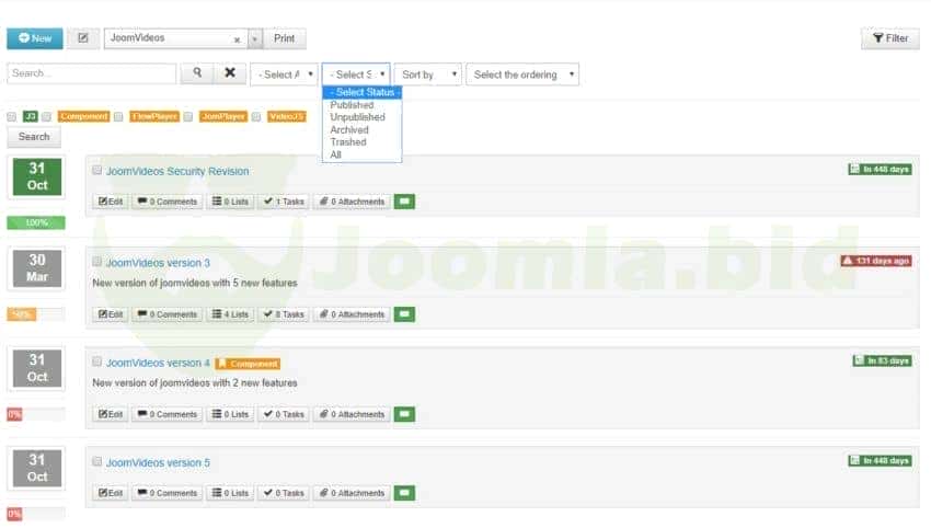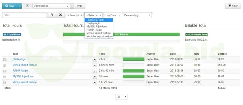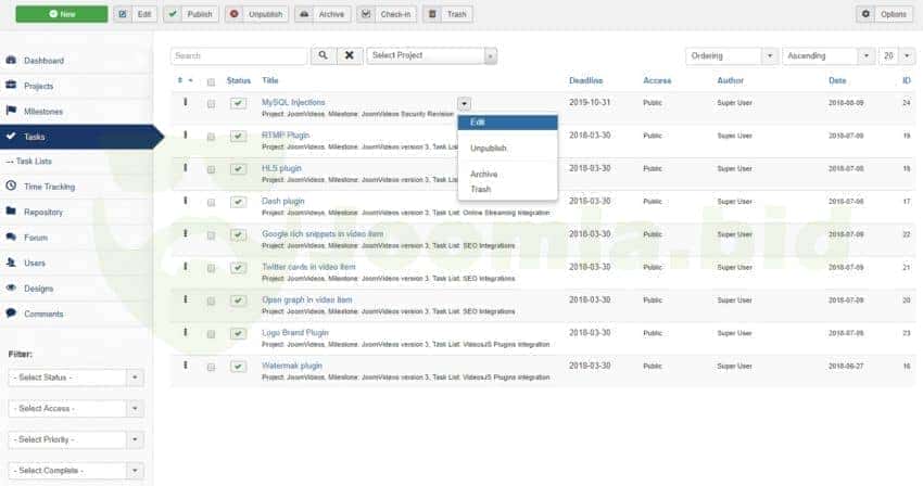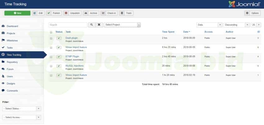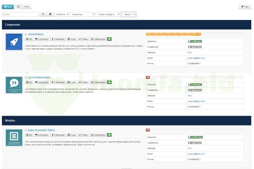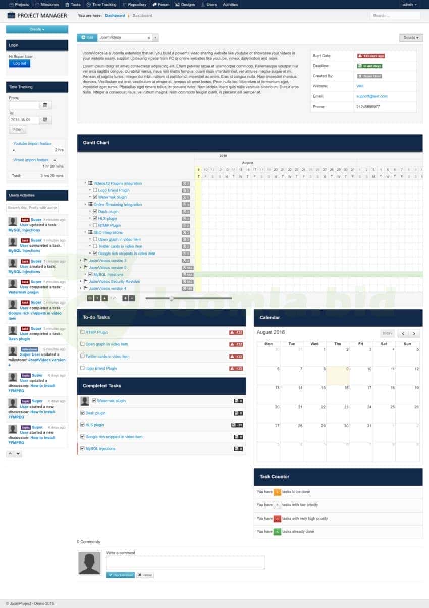 JoomProject is the best Joomla project management software for Joomla CMS with tons of features (milestones, tasks, files, calendar, discussions, timesheets, and much more...)