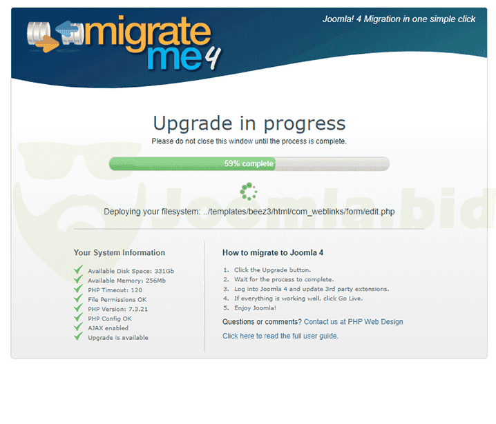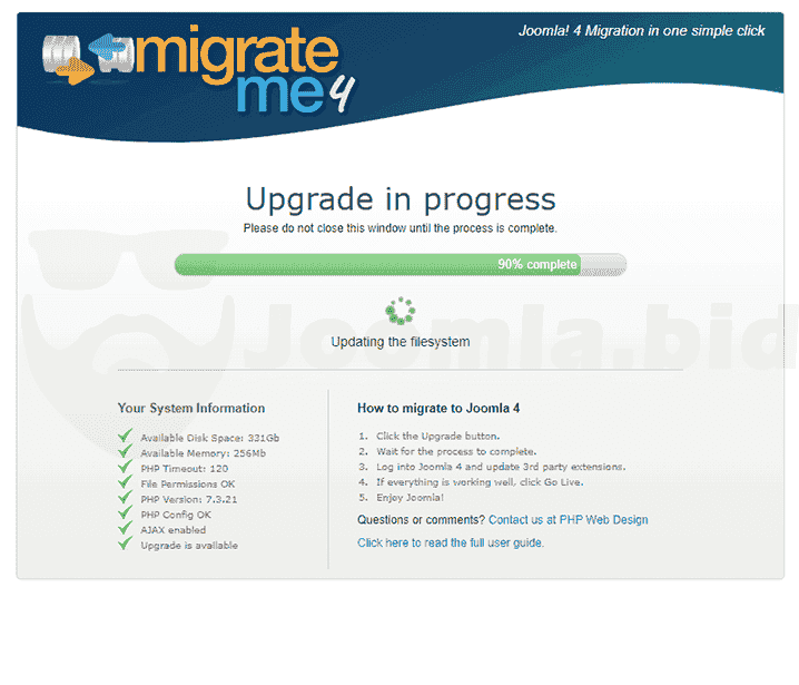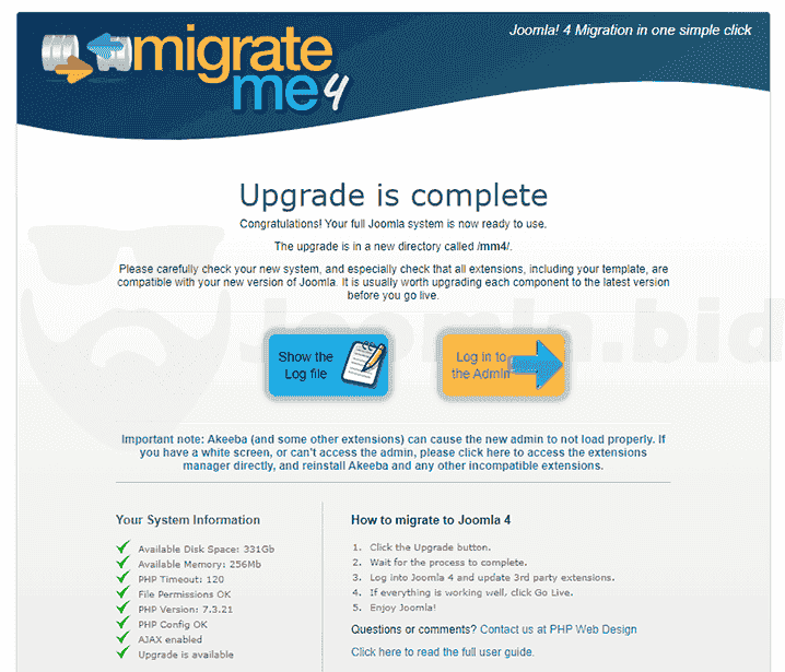 And in that time, MigrateMe 4 will copy all your existing files, duplicate your database, install Joomla 3, update your Admin area, save all your articles and data and switch you to the new Joomla 4 Admin interface.