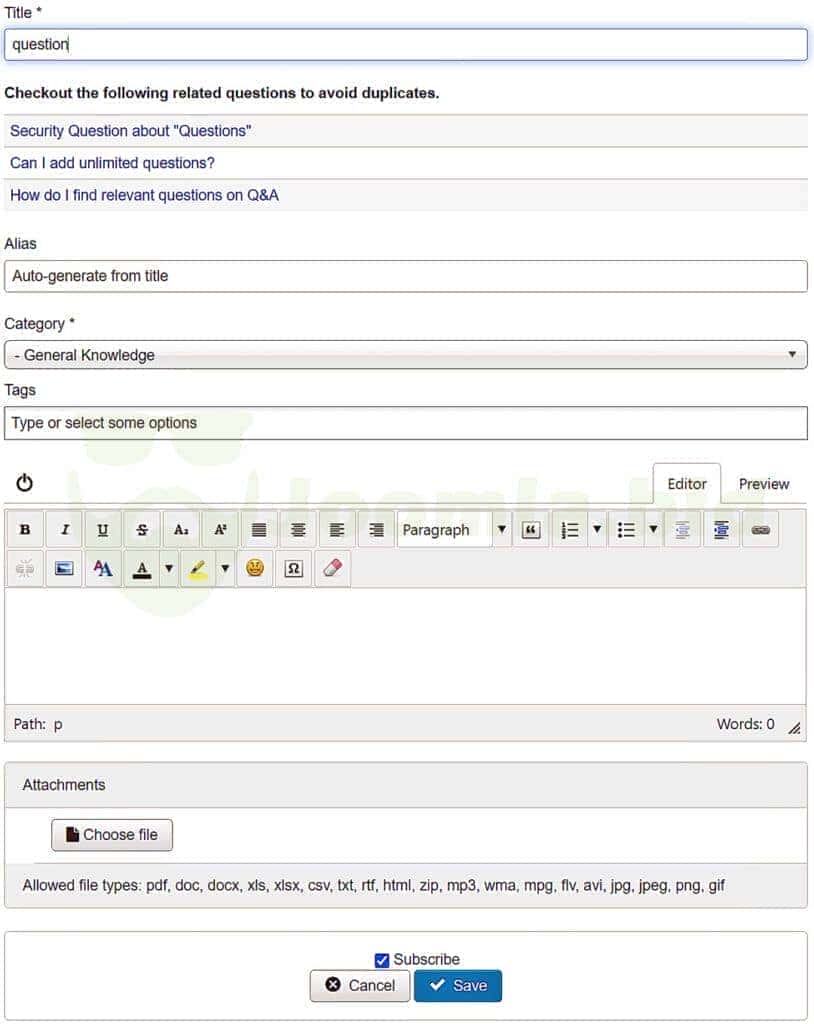 - WYSIWYG Editor support: You can use your Joomla editor to post questions and answers. You can set up permission for which user groups can have this permission.