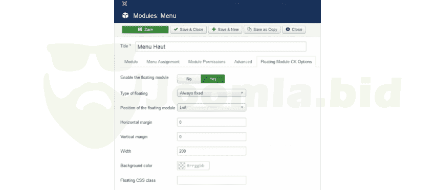 - One click activation - Apply to any module - Responsive behavior - Multiple float method : always float, or float only when the top of the screen touch the module - Options for distance with the screen - Float multiple modules in the same page