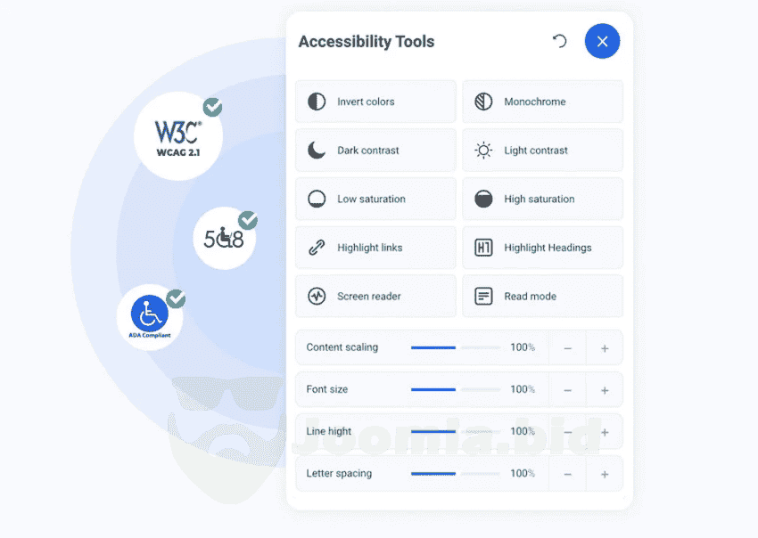 DJ-Accessibility - it's an accessibility Joomla plugin working with Joomla 4 as a standalone plugin and with YOOtheme Pro as the integrated solution. The accessibility plugin provides accessibility compliance with WCAG and ADA standards. Use its' options to improve the accessibility of your website! You can display accessibility options in a pop-up or a toolbar on your page.