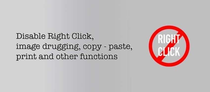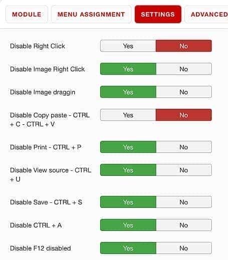 In module settings is optional to disable Right Click for all the page or only in images, image drugging and keyboard shortcut keys "Ctrl + A", "Ctrl + C", "Ctrl + V", "Ctrl + P", "Ctrl + S" , "Ctrl + U", F12 (Developer Tool).
