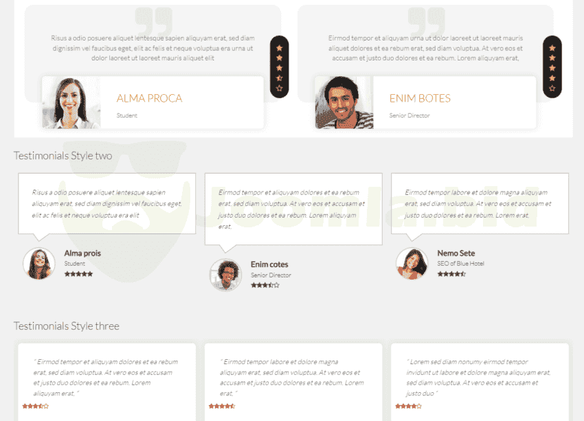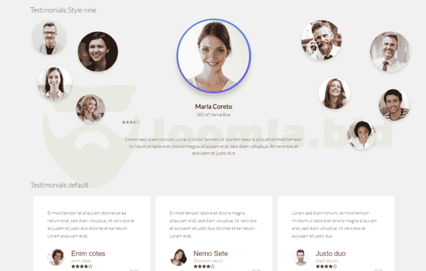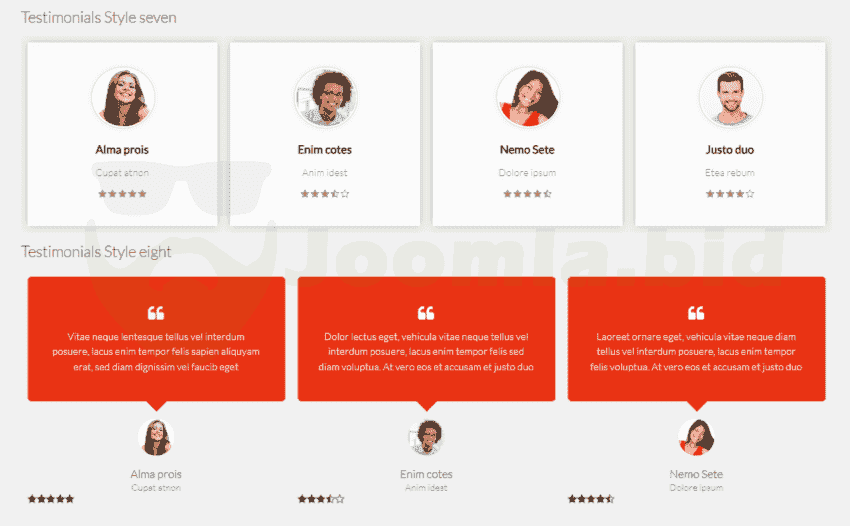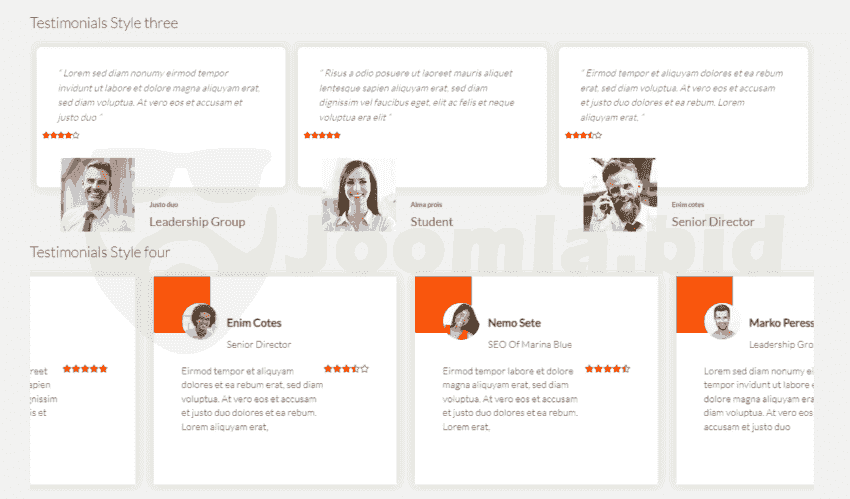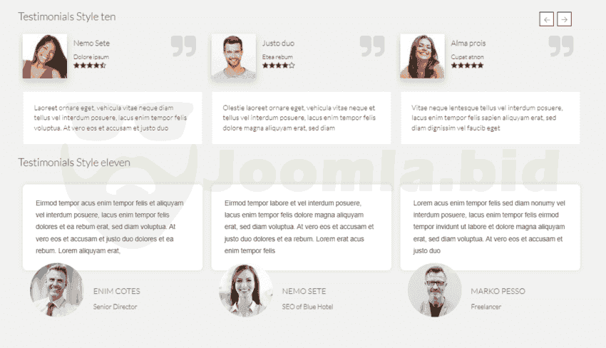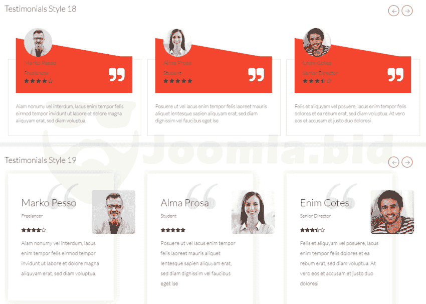 Ol Testimonials module is designed to showcase testimonials in a slideshow. It is designed to showcase testimonials in a slideshow. in this module are included 19 different styles. The free version has only one style and rating stars is not available.