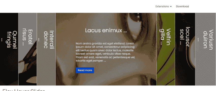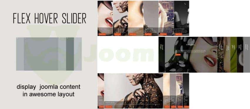 Flex hover slider has effect when hovering over an image, and animated title and descriptions. It displays joomla articles from selected categories with photo, title, text info and read more button.