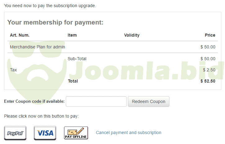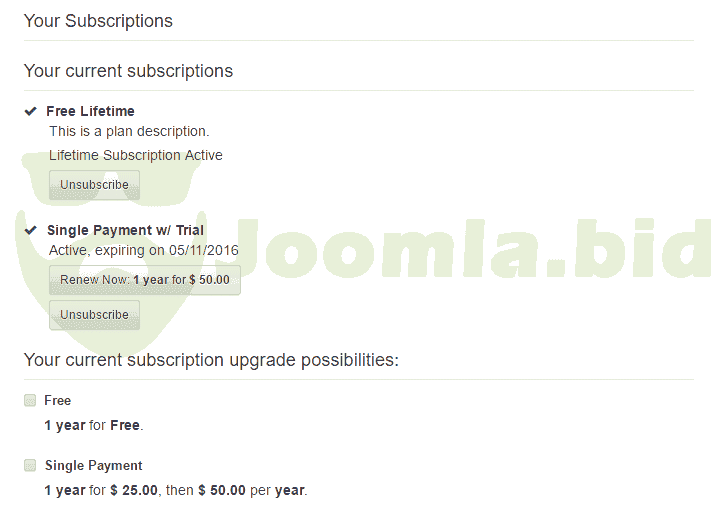 Seemless integration with Joomla ACL system lets you configure your subscription plans to automaticall bump subscribers to a new group and remove them when subscription expires. Great way to give your subscribers extra access benefits.