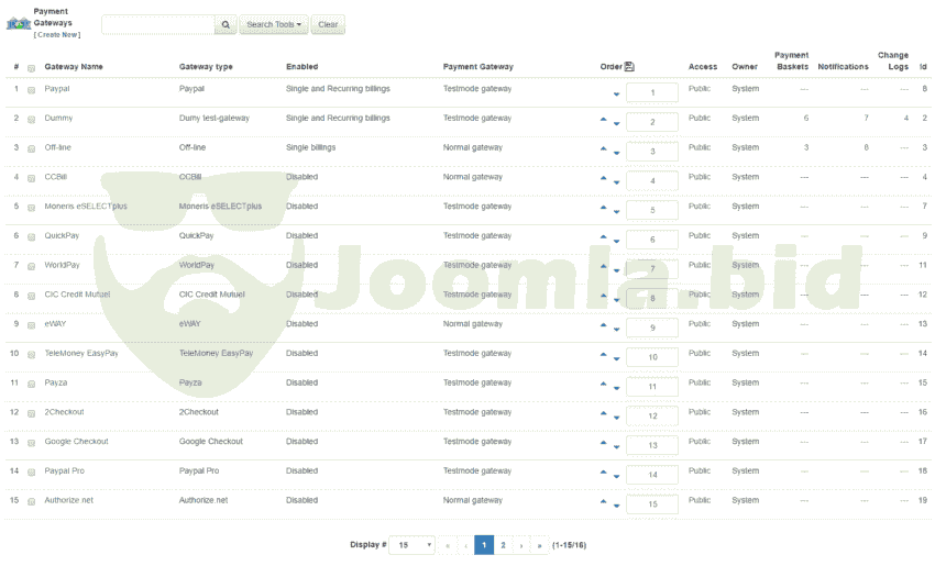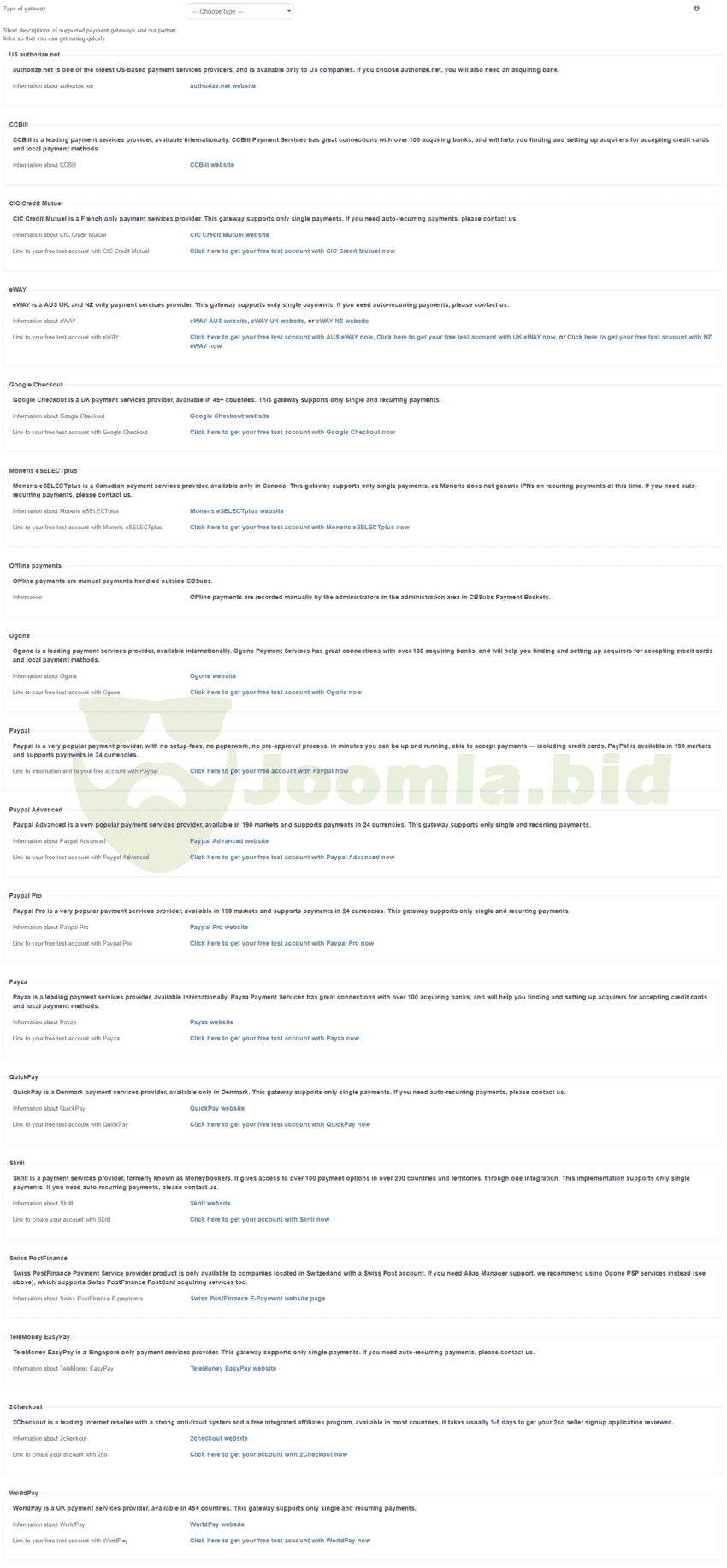 Select the payment organizations that work best for your business. 18 options include: Paypal, Paypal Pro (Payflow Pro and Website Payments Pro), PayPal Advanced (Hosted Checkout), TwoCheckout, Authorize.net, Ogone, PostFinance, Stripe (new) CCBill, WorldPay, AlertPay, CIC Credit Mutual, QuickPay, Moneris, eWay, TeleMoney EasyPay, offline and dummy (for testing). (With a wide range of payment processors you can use the gateway that fits your needs and your local!)