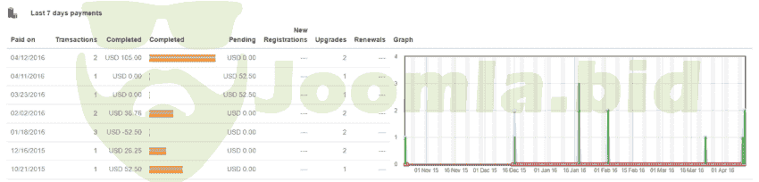 Last 7 day payment panel lets you quickly monitor your revenue stream. Clean table view and graph lets you follow your income, transactions, upgrades and registrations. More details and options are available from the Statistics panel area. (Monitor your payments through the use of statistics and robust backend management.)