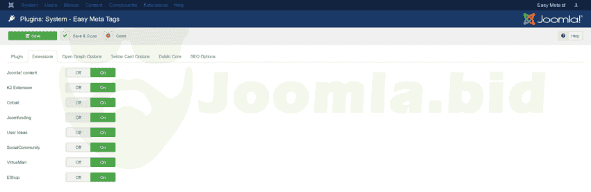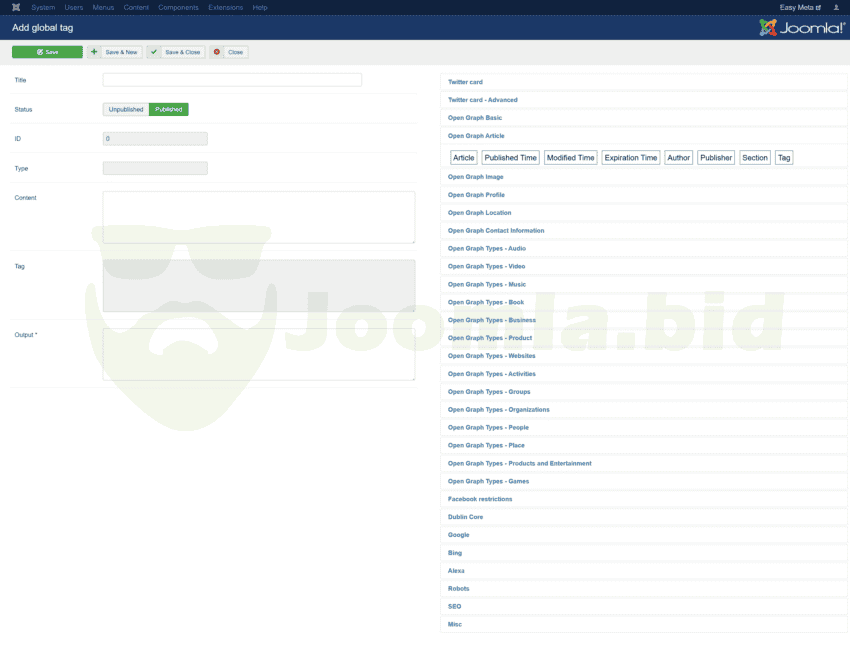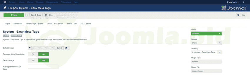 Easy Meta is simple easy and powerful joomla! extension allows you manages meta data and add semantic data in you website page's head. it contains predefined Open Graph, Facebook, Twitter, Google, Dublin Core and other SEO tags.
