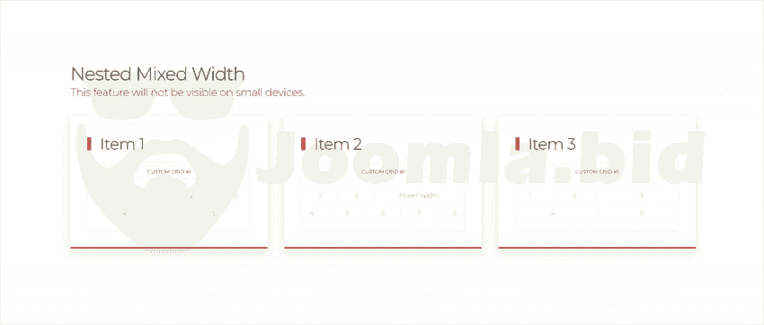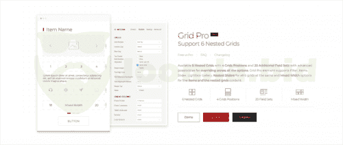 Unlimited Sublayouts, 6 Nested Grids with 8 Grids Positions and 20 Additional Field Sets with advanced possibilities for overriding across all the options. The Grid Pro element supports Multiple Filters, Items Slider, Lightbox Gallery, Nested Sliders and Mixed Width options for the Items and the Nested Grids content.