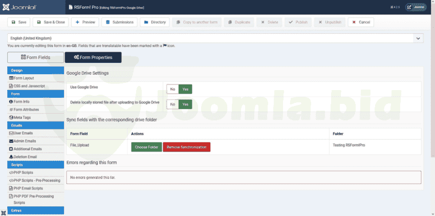 - Access your form in the backend > Components > RSForm!Pro > Manage Forms > your form > Form Properties > Google Drive Settings tab.