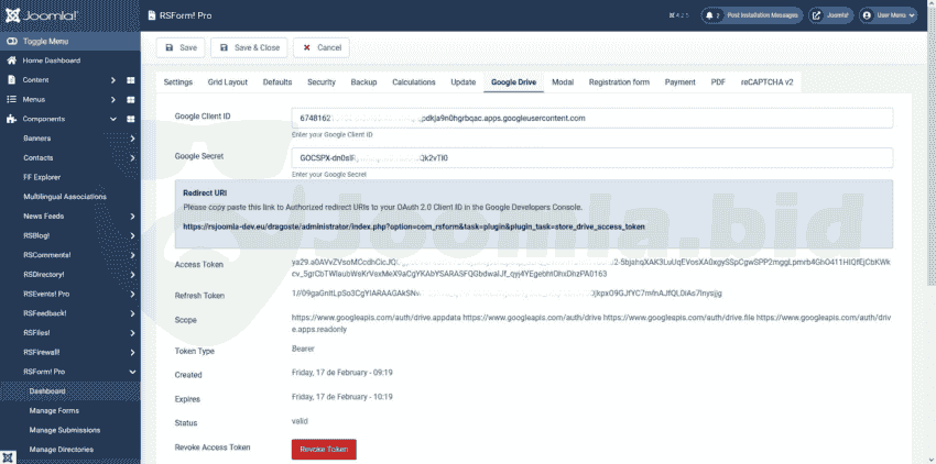 - Clicking the Allow button will redirect back to your website where a successful green "Access token successfully stored!" message should be encountered if everything was properly configured. Eventually you'll view more data being specified within the Google Drive tab of your RSForm!Pro configuration, though there's no need to further change anything here.